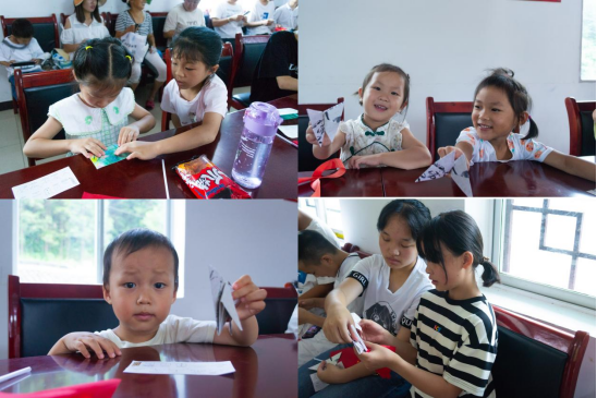志愿者手把手带领留守孩童学习手工花制作和彩纸折蝴蝶技巧。小朋友各自挑选喜欢的彩纸和制花工具,依照彩纸上虚线和实线的指示逐一对折并剪裁,在志愿者“一对一”耐心的上重复动作讲解中反复学习手工技巧,直到一束束绢花、一只只彩蝶呈现在众人面前时,孩子们脸上终于洋溢出最美的微笑。在兴趣中培养动手能力,在合作中增进情感交流。