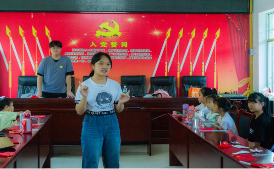 “半世生涯戎马间,一生系得几危安......”在埔坪村村委党员活动室内,实践团志愿者带领三十多名儿童挥动小红旗诵读粟裕诗词《七律·抒怀》,领略大将对党、对革命事业的坚贞不渝。诵读声稚嫩但感情真挚。在音乐的伴奏下,全体小朋友整齐划一做着简单的舞蹈动作并跟随志愿者高声学唱《东方红》经典红歌,致敬伟大领袖毛主席。孩子们在唱、跳、诵过程中培育了爱党爱国的朴素情感,红色文化在潜移默化中生根发芽。