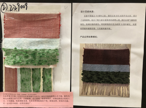 学生作品在众多参赛作品中脱颖而出,喜获一等奖一项,二等奖五项,三等奖六项。其中陈顺、唐文燕、李庆同学《东方红太阳升作品》获得机织服用织物设计组一等奖。同时谭冬宜、冯浩、李婧老师获得优秀指导教师奖。