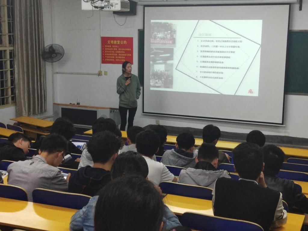 宣讲会伊始,公司负责人向同学们亲切问好后开始简单介绍了公司的整个发展历程,告诉同学们公司是如何由一家传统纺织作坊一步步发展成为一家面向世界的大企业的。然后,主讲人员详细地介绍了公司主打产品——织带,织带可谓渗透到了生活的方方面面,常见的背包、安全带都离不开它,并表示公司的产品涉及到休闲、户外运动乃至医疗等多个领域。并且公司不仅和大量国际知名品牌合作,生产机器上,工厂引进了许多自动化机器,节约了大量劳动力成本,有许多高科技设备,使工作更加便利,而且公司还有自己专业的研发团队,已经取得了多项专利,这能给刚踏出校园的大学生们一个很好的施展才华舞台,在专业的指导下能更好地激发同学们的潜能。最后,她介绍了公司有良好的工作生活环境,宿舍家电、休闲娱乐一应俱全,能够为员工提供最舒适的工作生活环境,并表示特大纺织品(深圳)有限公司期待着各位同学的加入。