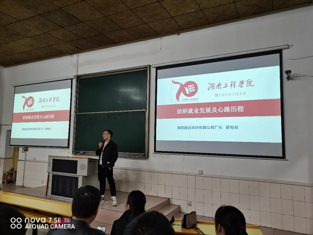 值此湖工70华诞之际,优秀校友代表、全体师生欢聚一堂。纺织工程教研室特别邀请了两位优秀校友于2021年10月16日20:00-22:00在电教105教室给全体2021级纺织工程专业新生进行了经验交流会,纺织工程专业谭冬宜老师、刘常威老师和罗凤香老师也出席了本次经验交流会。