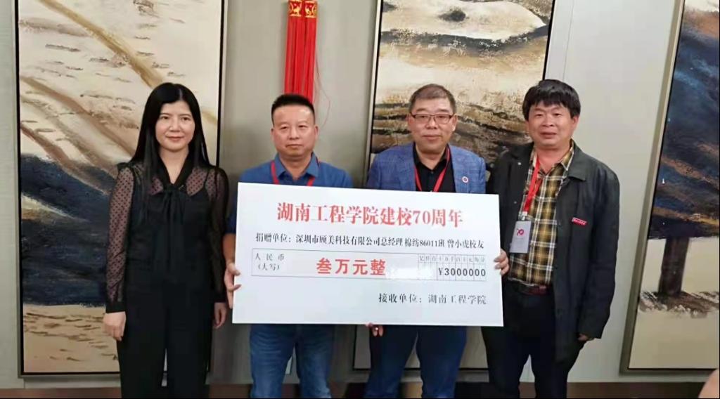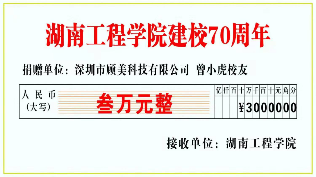毕业以来曾小虎校友一直挂念母校发展,其所在的深圳市顾美科技有限公司也与母校建立了校企单位友好合作关系。他表示:母校的培养成就了现在的他。“锲而不舍,敢为人先”的校训他一直铭记于心!此次捐赠也是希望助力湖工的发展,鼓励学子们努力奋斗,不负青春,与母校一起发展,一起跨上更高的台阶。