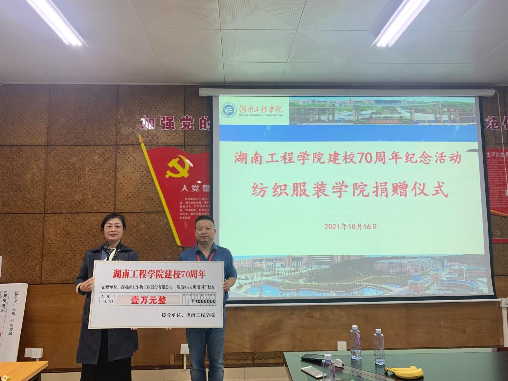 建校七十周年之际,我校服装93251班校友,深圳海王生物工程股份有限公司湖南区域总裁贺国军为母校捐款一万元,助力纺织服装大楼建设。