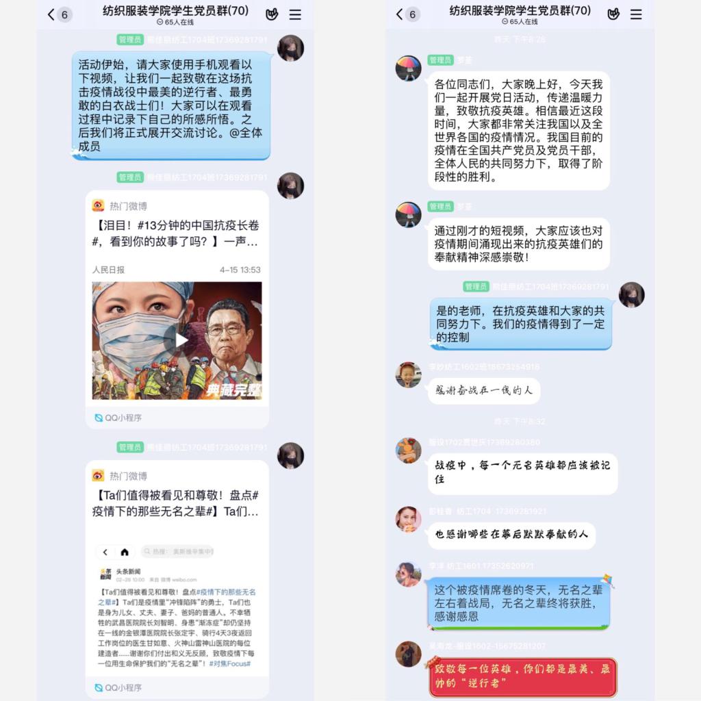 学生党支部于4月29日晚上20:00以“传递温暖力量,致敬抗疫英雄”为主题开展线上党日活动。本次党日活动由学生第一支部书记罗荃主持,参与人员为全体学生党员。