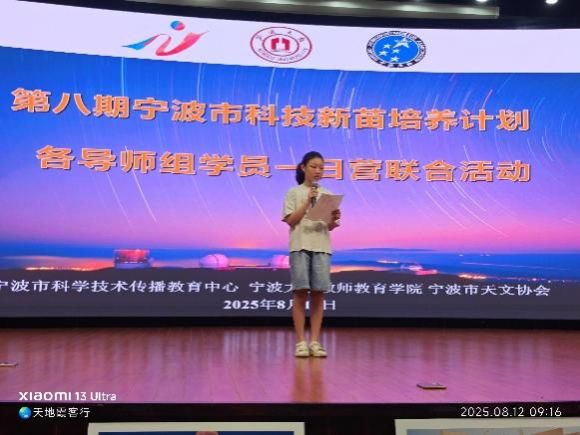 随后举办方把舞台还给同学们,宁波外国语学校的陈宇暄同学和北京师范大学余姚实验学校的刘子瑞同学作为科苗学员代表先后上台发言,她们各自分享了自己对科学的热爱与探索经历。陈宇暄在分享中提到:“在科苗天文组暑期集训的过程中,‘夯实基础、探索前沿’不再是口号,而是化作一次次实实在在的实践”,近一周的时间真正体会到“以镜观天,以文化人”的含义。随后的刘子瑞则真诚地表示:“现在才懂,支撑我奔波的不是任务,是藏不住的好奇,是想知道‘为什么’的冲动,是想试试‘能不能’的较劲。”稚嫩的声音里满是对科学的向往,也让在场的人感受到了科学探索的魅力。