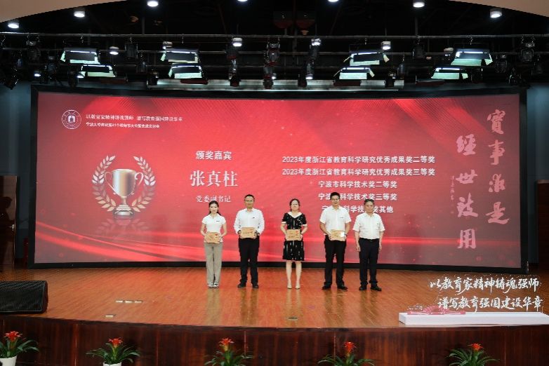 校领导为我院获得2023年度浙江省教育科学研究优秀成果奖二等奖的林玉慈老师(左一)颁奖