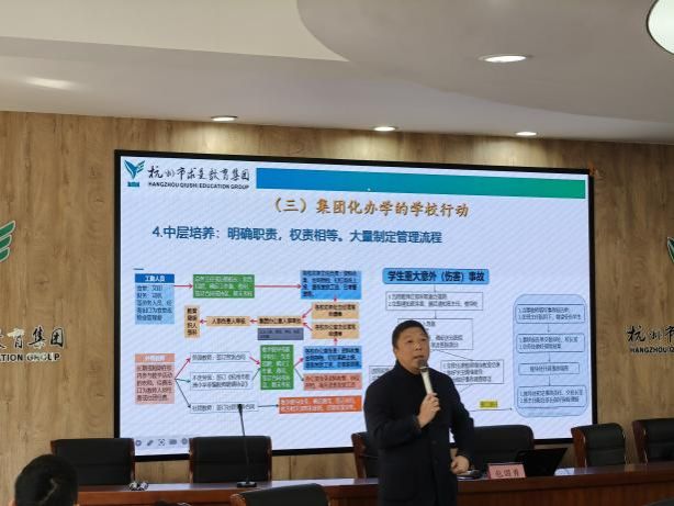 当日上午,研修班学员首先抵达杭州市西湖区求是教育集团浙江大学附属小学。在参观校园环境后,包国勇校长以《双新背景下学校课程的设计与实践》为题展开讲座。讲座围绕 “育人优先于教书、集体利益高于个人”的核心理念,系统分享了学校的办学实践:通过 “求是故事” 平台记录师生暖心瞬间,搭建跨层级沟通桥梁;推行集团化管理模式,根据学校发展阶段灵活调整 “名校带新校” 的管理策略,兼顾标准统一与个性发展;创新岗位目标责任制,由全体教职员工共同制定 78 条岗位规范,实现权责对等、管理有据;构建 “基础课程 + 个性课程 + 社会适应课程” 的多元课程体系,通过科技节、劳动教育等特色活动,培养学生责任感与综合素养。包校长结合学校真实案例,生动诠释了 “以学生为中心” 的教育初心,让学员深受触动。