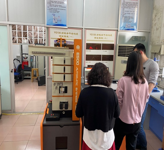 条干均匀度测试仪是我院新购进的仪器,该仪器可以用于测试分析条子和粗纱的条干线密度不匀的结构特征。本次培训,工程师主要围绕条干均匀度测试仪的结构,数据计算,监控软件平台操作,查阅CV %值、波谱图、变异——长度曲线,线密度频率分布图等内容进行讲解。最后通过实际操作、现场展示的方式为参训人员详细介绍了条干均匀度测试仪的使用方法。