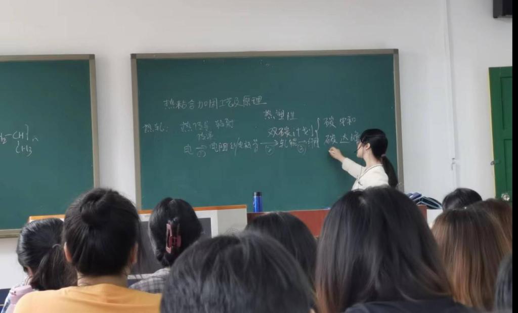 课程以热粘合加固原理与工艺为主线,围绕热轧粘合原理和方式来展开。以热轧粘合中使用具有热塑性的高聚物为纤网原料,通过加热加压的方式,使纤网熔融固化,达到取代传统化学粘合剂的效果,能耗仅为化学粘合的1/3-1/5,降低了产品的能耗。罗凤香老师深入挖掘课程思政元素,将热粘合加固过程中的节能减排方式和清洁生产效果与我国实现“双碳计划”的“碳达峰”和“碳中和”目标相结合,有效将绿色环保的理念根植于学生的心中,鼓励同学们为将来行业的 “清洁绿色”发展方向贡献力量,达到润物无声的育人效果。