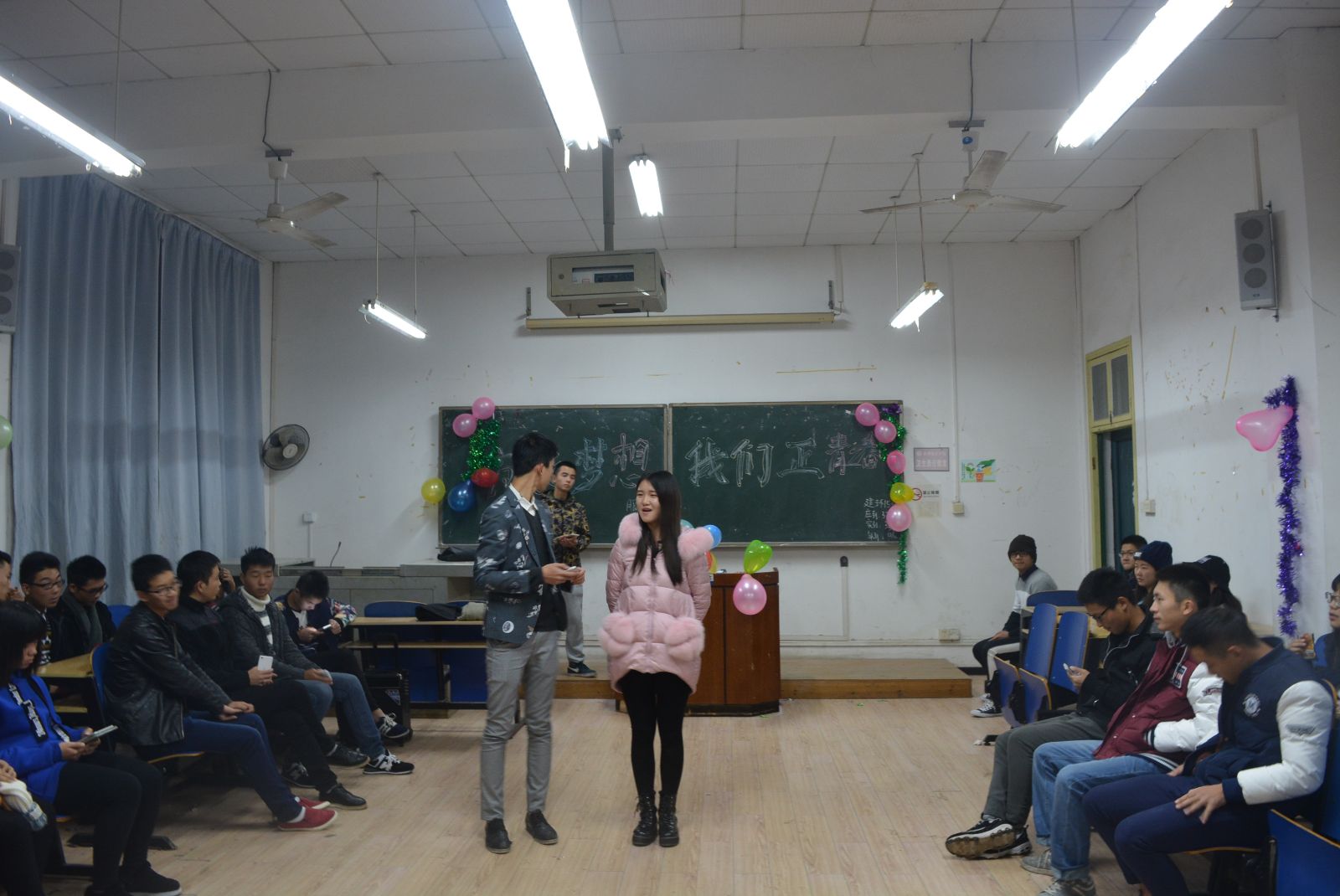 活动以一阵独具青春气息的音乐拉开帷幕。首先,主持人向大家询问:你的梦想是什么?你对于青春的诠释是什么?同学们积极抢答,讲述着自己对于青春与梦想的独特理解,且引起了全场共鸣,现场气氛充分被调动起来。随后,同学们积极投入一系列游戏活动中。特别是“蒙眼背人踩气球”游戏:男生在女生的指挥下,一一将气球踩爆,赢得了全场欢呼。其中一组选手被调皮的气球弄得晕头转向,使得全场同学笑得前仰后合,现场气氛高涨。最后,活动在主持人派发糖果的温馨氛围中圆满结束。
